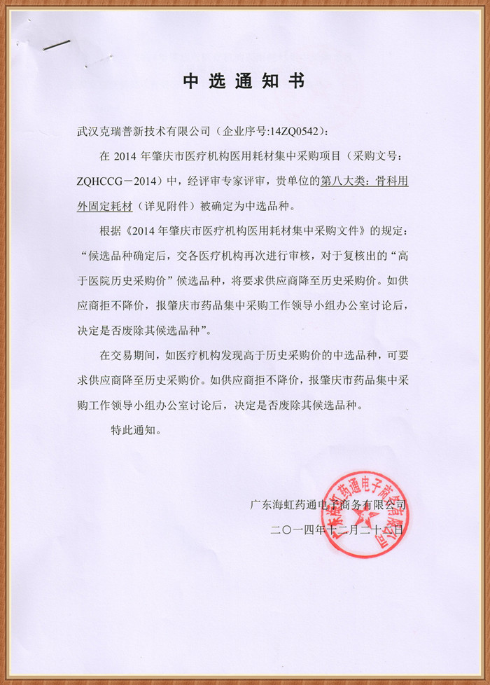 【廣東省2014年肇慶市醫(yī)療機構(gòu)醫(yī)用耗材集中采購項目中標(biāo)通知書】武漢克瑞普新技術(shù)有限公司(采購文號:ZQHCCG-2014)中我們公司生產(chǎn)的骨科用外固定耗材產(chǎn)品已成功中標(biāo),我們的骨科耗材產(chǎn)品種類較多,全部為一類的骨科耗材產(chǎn)品歡迎各大經(jīng)銷商與我們?nèi)〉寐?lián)系。