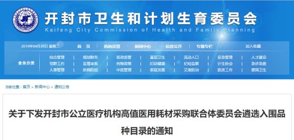 4月30,開封市衛(wèi)健委發(fā)布《關于下發(fā)開封市公立醫(yī)療機構高值醫(yī)用耗材采購聯(lián)合體委員會遴選入圍品種目錄的通知》(以下簡稱《通知》)。