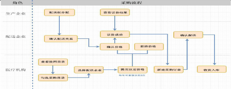 企業(yè)通過平臺(tái)“公示欄”查看公示掛網(wǎng)產(chǎn)品信息。掛網(wǎng)成功的產(chǎn)品,企業(yè)使用CA或賬號(hào)登錄進(jìn)入交易系統(tǒng),確定配送關(guān)系,開展醫(yī)療機(jī)構(gòu)網(wǎng)上議價(jià)采購。